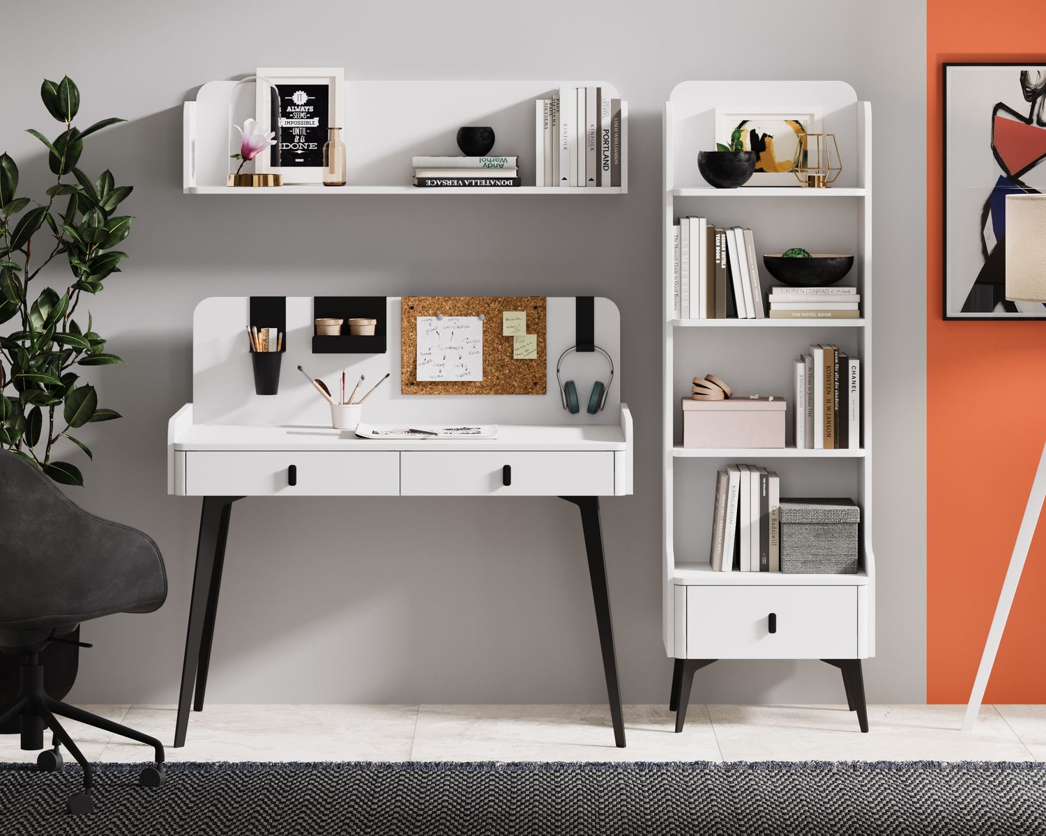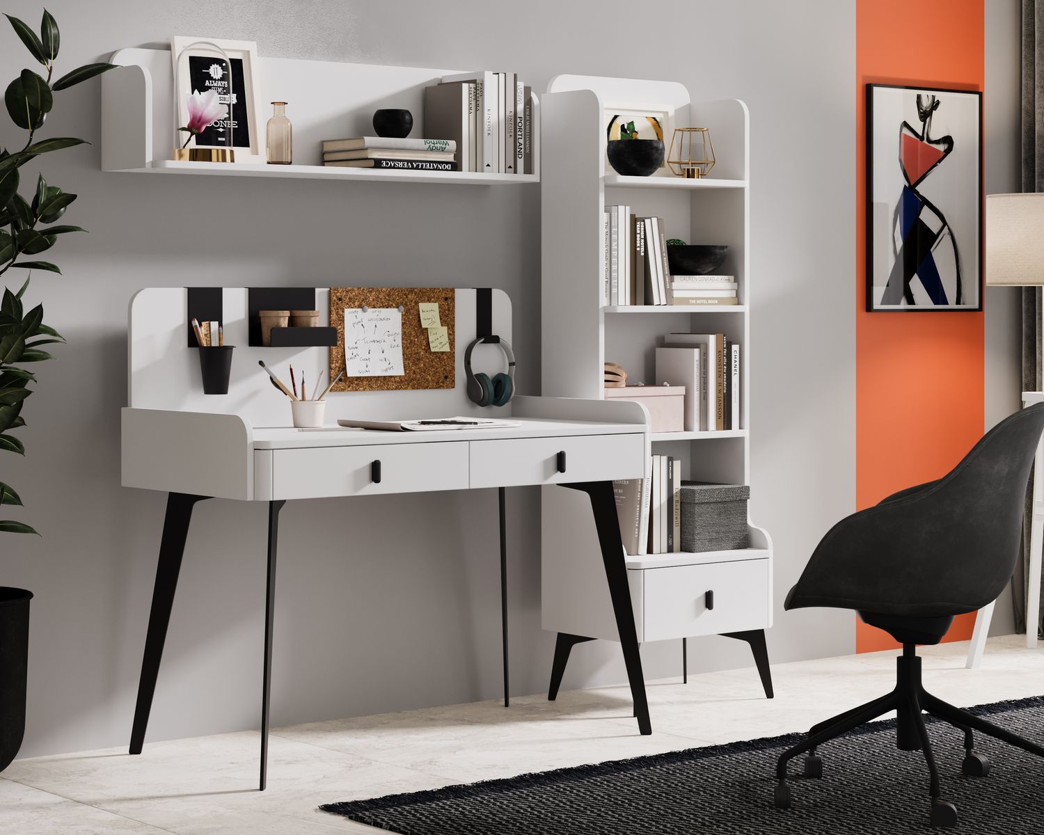 Der »Vena« Schreibtisch besticht durch seine klare Linienführung und die harmonische Kombination aus Weiß und Schwarz. Die melaminbeschichtete Spanplatte und MDF mit ABS Kante verleihen dem Möbelstück eine elegante Optik und sorgen für eine langlebige Nutzung. Die schwarzen Metallfüße und der passende Metallgriff setzen moderne Akzente, die den Schreibtisch zu einem echten Hingucker machen.