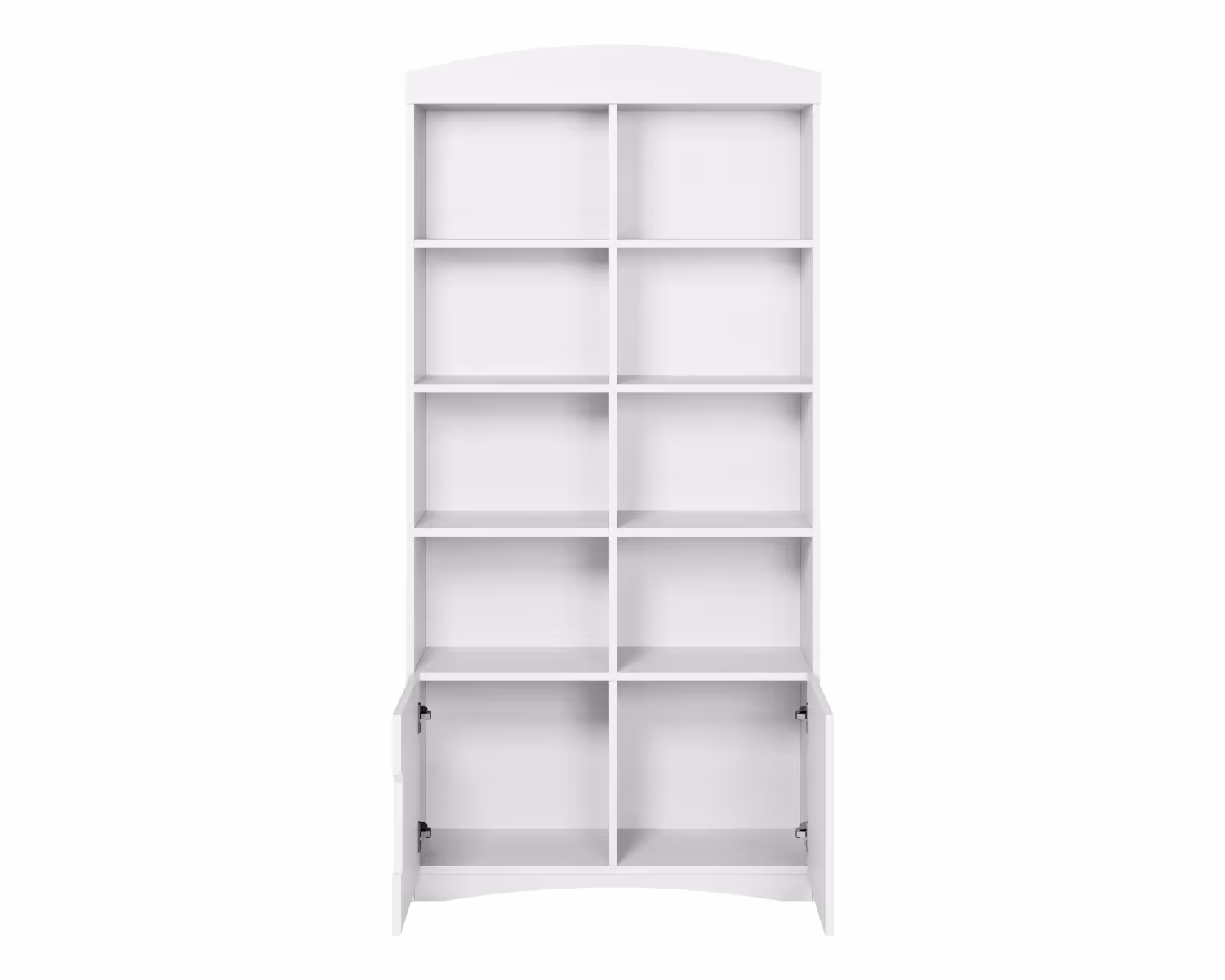 Das Doppelregal, welches gerne als Bücherregal verwenden wird, besteht aus 10 Fächern, jeweils 5 untereinander, von denen die zwei untersten nebeneinander liegenden Fächer noch eine Tür hat, um das Fach zu schließen.