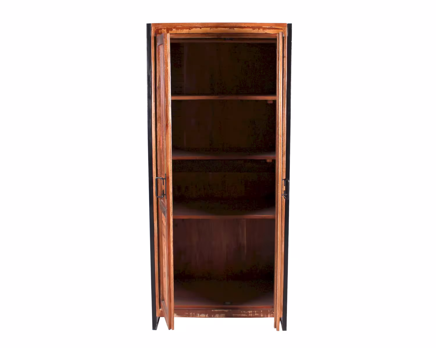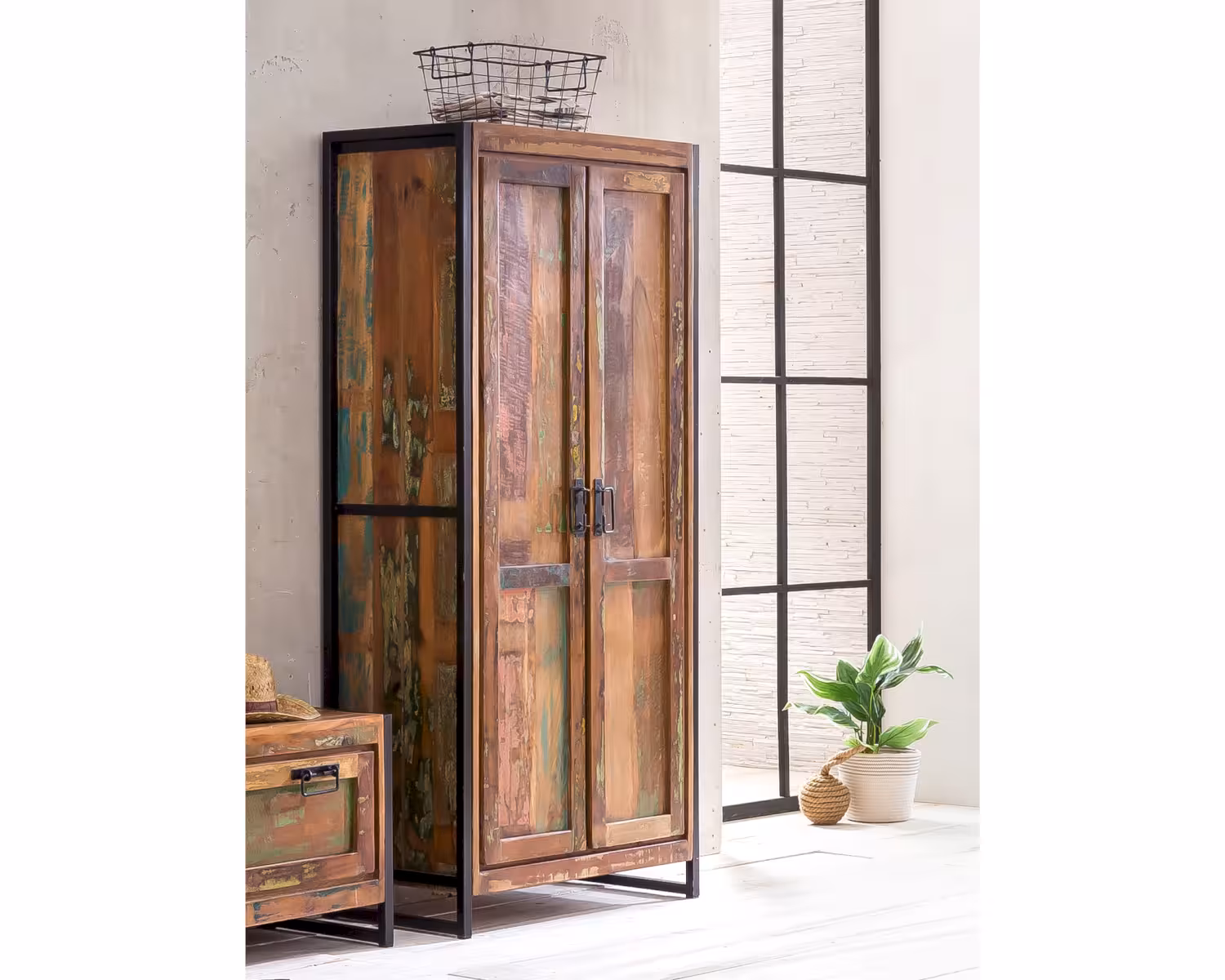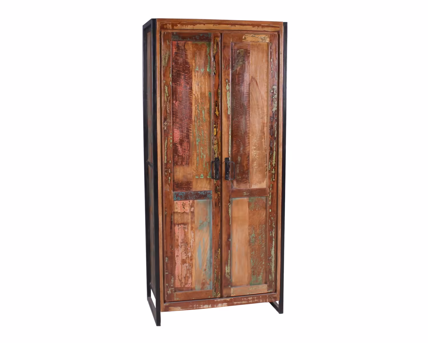 recyceltes Altholz, bunt lackiert mit schwarzem Altmetall und Gebrauchsspuren